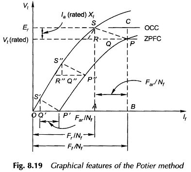 Point P on the ZPFC corresponds to terminal voltage Vt (rated) and a field current of OB = Ff/Nf. Corresponding to point P on the ZPFC, there will be a point S on the OCC which pertains to the emf Er and the resultant excitation OA = Fr/Nf (=Ff/Nf – Far/Nf).