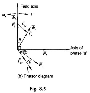 Knowing the magnetization characteristic of the Armature Reaction in Synchronous Motor and the proportionality constant Kar, the phasor diagram of Fig. 8.5(b) can be constructed for given operating conditions (say, for generating mode) wherein no approximation of neglecting the non linearity need be made. The next step then is to find the terminal voltage of the machine which immediately follows from the phasor equation