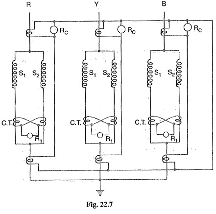 In single turn generator (e.g. large steam-turbine generators), there is no necessity of protection against inter-turn faults. However, inter-turn protection is provided for multi-turn generators such as hydro-electric generators. These generators have double-winding armatures (i.e. each phase winding is divided into two halves) owing to the very heavy currents which they have to carry. Advantage may be taken of this necessity to protect inter-turn faults on the same winding. Fig, 22.7 shows the schematic arrangement of circulating-current and inter-turn protection of a 3-phase double wound generator. The relays RCÂ provide protection against phase-to-ground and phase-to-phase faults whereas relays R1 proÂvide protection against inter-turn faults.