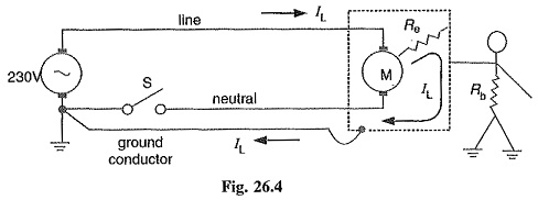 We are frequently in touch with electrical equipment of all kinds, ranging from domestic appliances and hand-held tools to industrial motors. We shall illustrate the need of effective equipment grounding by considering a single-phase circuit composed of a 230 V source connected to a motor M as shown in Fig. 26.1. Note that neutral is solidly grounded at the service entrance. In the interest of easy understanding, we shall divide the discussion into three heads viz. (i) Ungrounded enclosure (ii) enclosure connected to neutral wire (iii) ground wire connected to enclosure.