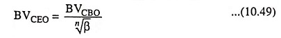 Breakdown Voltage : Common-Base Characteristics. Figure 10.79 shows the output characteristics for common base NPN transistor with breakdown voltage. Consider the curve for iE = 0 the emitter terminal is effectively opened. The collector-base junction breakdown voltage is indicated as BVCBO. This is simplified figure in that it shows breakdown occurring abruptly at BVCBO. For the curves iE > 0, breakdown actually begins earlier. The carriers flowing across the junction initiate the breakdown avalanche process at somewhat lower voltages.