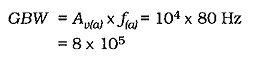 The gain-bandwidth produce (GBW), or unity-gain bandwidth, of an operational amplifier is the open-loop gain at a given frequency multiplied by the frequency. Referring to the Av/f response for the 741 reproduced in Fig. 15-13, it is seen that at Av(a) = 104, the frequency is f(a) ≈ 80 Hz. Thus,