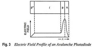 Ans. Geometrical structure and electric field profile of an Avalanche photodiode are shown in Figs. 2 and 3 respectively.