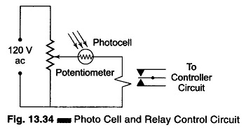 A typical control circuit utilizing a photo conductive cell is illustrated in Fig. 13.34. The potentiometer is used to make adjustments to compensate for manufacturing tolerances in photocells sensitivity and relay operating sensitivity.Â