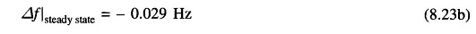 Proportional Plus Integral Control – It is seen from the earlier discussion that with the speed governing system installed on each machine, the steady load frequency characteristic for a given speed changer setting has considerable droop, e.g. for the system being used for the illustration above, the steady state droop in frequency will be 2.9 Hz [see Eq. (8.23b)] from no load to full load (1 pu load).
