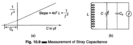 The frequency of the oscillator in the Q meter is varied and the corresponding value of C for resonance is noted. 1/f2 is plotted against C in picofarads, as shown in Fig. 10.9(a). The straight line produced to intercept the X-axis gives the value of Cs, from the formula given on the next page. The value of the unknown inductance can also be determined from the equation.