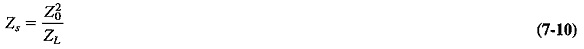 Consider Figure 7-8, which shows a load of impedance ZL connected to a piece of transmission line of length s and having Z0 as its characteristic impedance. When the length s is exactly a quarter-wavelength line (or an odd number of quarter-wavelengths) and the line is lossless, then the impedance Zs, seen when looking toward the load, is given by