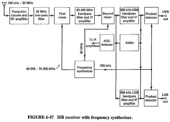 A typical block diagram is shown in Figure 6-47. This is actually a much simplified version of the receiver of Figure 6-18, which is capable of receiving all forms of AM but has here been shown in the ISB mode. The receiver has a number of very interesting features, of which the first is the fixed-frequency RF amplifier.