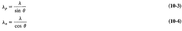 In Figure 10-7, it is seen that the wavelength in the direction of propagation of the wave is shown as λ, being the distance between two consecutive wave crests in this direction. The distance between two consecutive crests in the direction parallel to the conducting plane, or the wavelength in that direction, is λp, and the wavelength at right angles to the surface is λn. Simple calculation again yields
