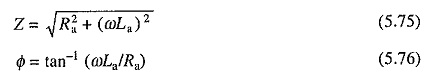Solution of Eq. (5.72) has two components—one due to the ac source (Vm/Z) sin (ωt – Φ), and other due to back emf ( – E/Ra). Each of these components has in turn a transient component. Let these be represented by a single exponent K1e-t/Ï„a, then