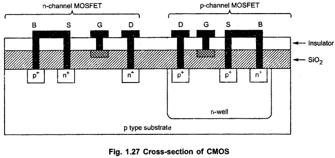 In the fabrication of p-channel MOSFET two additional steps are required as compared to n-channel MOSFET fabrication. The additional steps are formation of n-well and ion-implantation of p-type source and drain regions. The cross section of CMOS IC is as shown in the Fig. 1.27.
