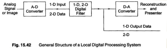 In the second system of Fig. 15.43, an analog signal or image is converted to digital form as in Fig. 15.42, and the data so obtained is processed by a 1-D or 2-D digital filter as required, to specify and delimit the band widths or to perform suitable corrections on the signals.