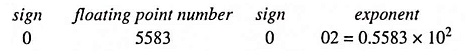 The floating point representation of a number have two parts, the first part is signed, fixed point number called the mantissa and the second part is signed exponent. For example, 55.83 is represented as